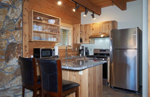 Situated at the front of the Lodge, this unit is split between the ground and upper level with a private balcony for views overlooking Main Street and the mountains. On the ground level there is a cozy sitting area with original rock fireplace open to the dining and kitchen areas. There is a large dining table that seats eight. The kitchen has a breakfast bar and has a refrigerator, propane range, and dishwasher. It is stocked with dishes, pots and pans, utensils, and basic spices and condiments. There is a coffee pot and coffee provided. On the main level, there is a spacious bedroom with a king bed and private bath with walk-in shower. Stairs lead to the upper level where this an open loft with two queen beds and a game table. Doors lead to the private balcony. There is one bedroom upstairs and a shared bathroom with walk-in shower. This unit can accommodate a total of eight guests. There is wireless internet throughout and Dish TV in the living area.