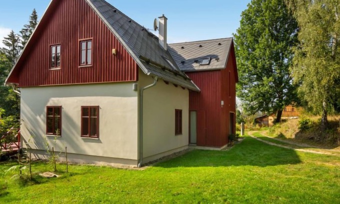 Mezná: Child friendly, modern, cosy 2-family house "Na mechu", 2 storeys, built in 2012, surrounded by trees. 2 apartments in the property. In a quiet, sunny, elevated position, 600 m from the river, in the countryside. For shared use: garden furniture, barbecue, children's playground (slide, sandbox). In the house: WiFi, storage room for bicycles, central heating system, burglar alarm system. Storeroom available. 200 m long steep motor access. In Winter: please take snow chains. Parking (for 3 cars) at the house, public parking 200 m on the road. Shop 2 km, grocery 2 km, supermarket 5 km, restaurant 1 km, bicycle rental 5 km, bus stop "Mezná" 500 m, thermal baths "Bad Schandau" 18 km. Golf course (9 hole) 6 km, cross country ski track 6 km. Nearby attractions: Soutěsky Hřensko 1.8 km, Pravčická Brána, Skalní hrad Šaunštějn 5 km, Dolský Mlýn 7 km, Jetřichovické vyhlídky 10 km, Skalní hrad Falkenštejn 10 km, Bad Schandau (D) 16 km, Adrenalin park Jedlová 27 km.
