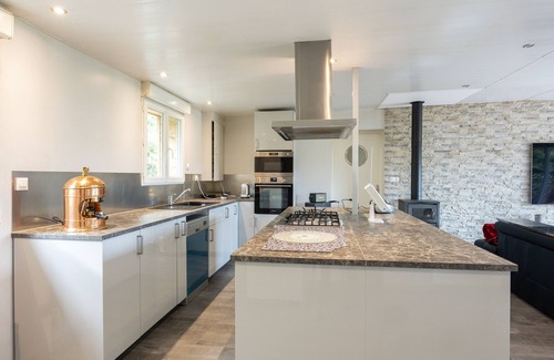 - An open kitchen equipped with electric kettle, oven, microwave oven, dishwasher, hotplates, espresso machine...