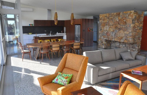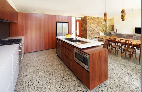 The house is designed around passive solar heating and cooling, but also has ceiling fans and reverse cycle air conditioning throughout.