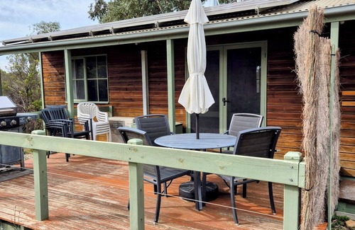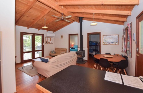 The property consists of two thoughtfully positioned cabins that are separated enough to provide privacy despite a shared backyard. The Pelican cabin features two bedrooms, one with a queen bed, the other with two sets of bunk beds, an open plan living space complete with a cozy slow combustion fire and a reverse cycle air conditioner. The cabin has a well equipped kitchen with an outdoor deck complete with a BBQ.