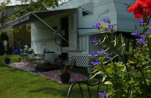 Self-contained travel trailer sitting in the prettiest creek-front spot on Lyons Creek where you can watch Canada Geese, Sandhill cranes with their babies and ducks visiting on the water. All comforts of home in a small frame, comfortable and cozy, a fully equipped vacation household. A BBQ is beside the trailer for your enjoyment.