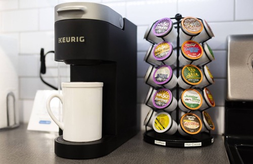 A full-size kitchen stocked with a new Keurig coffee maker, coffee, hot chocolate, cider, and tea. Pancake mix and basic cooking supplies too.