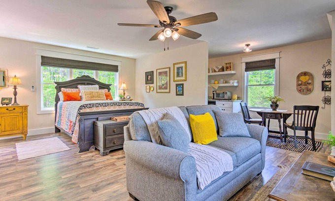 Your romantic Blue Ridge Mountains retreat awaits upon booking this contemporary studio vacation rental. Hosting modern comforts, 1 full bath, and beautiful scenery surrounding the property, this quiet escape has all the essentials for relaxing with a loved one after days of hiking, boating, and sightseeing. Head to a nearby park or reservoir before treating yourself at an area restaurant. Return home for a good night’s rest then enjoy some morning leftovers or prepare a home-cooked BBQ feast!