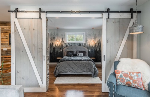 I could go on and on about the garden and yard areas (we are huge gardeners) but I had better tell you about the living space too! The Treehouse Escape has a private entrance and is a one bedroom guest house with a queen-size pull out couch in the living room. The gourmet kitchen features Quartz countertops and white shaker style cabinets. The bathroom has a rain shower head for a relaxing, spa-like experience. Double barn doors open to a beautiful bedroom with queen bed . Leave the doors open to watch tv and the LED fireplace from bed or keep them closed for privacy. French balconies in the bedroom and living area open to amazing sunset views.