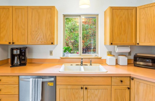 In the kitchen, you'll find plenty of pots, pans, cookware and dinnerware, for cooking up something warm and comforting after a day of adventures. All the appliance necessities are here: stove, oven, refrigerator and microwave. The dining area has room for four and is tucked in next to the kitchen.