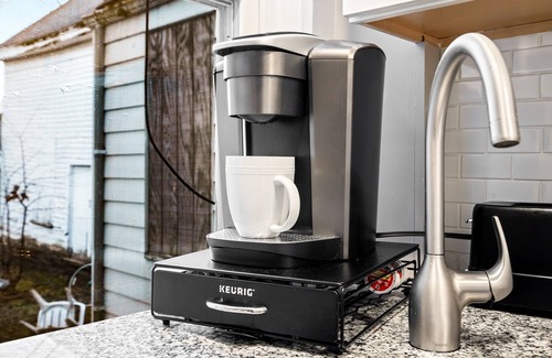 Microwave, Keurig coffee maker, cookware, utensils, and dishware