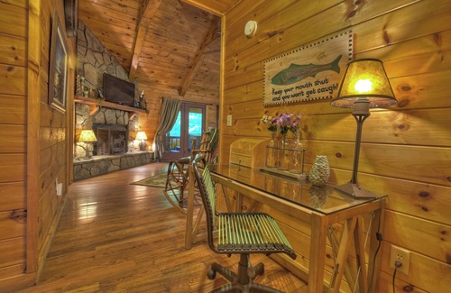 Inside, this luxury cabin rental in Blue Ridge exudes rustic elegance with upscale décor that captures the essence of a true mountain lodge. From custom bedding to quaint accessories, every detail adds to the warmth and charm of your home away from home. Curl up on the luxurious leather sofa in front of the wood-burning fireplace, perfect for cozy evenings with your loved one or unwinding after a day of adventure.