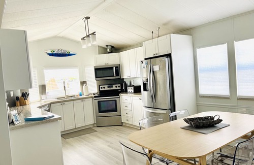 The Get-a-Wave Cottage is located in the waterfront community of Nettles Island (Lot #2091) in Jensen Beach, Florida (South Hutchinson Island). Situated right on the Indian River Intracoastal Waterway with a private dock and access to all of the community amenities. The home is a short 4-minute walk to the beach, and has been newly renovated for a modern, comfortable vacation stay. Open floor plan with amazing water views of the Nettles Marina and the Jensen Beach Bridge. The cottage offers a modern, fully-stocked kitchen with stainless steel appliances, dining and bar area, living room with water views, 2-bedrooms, 1-bathroom, deck and dock. Gated community with many amenities, close to restaurants, beach, family-friendly activities, nightlife, and more!
