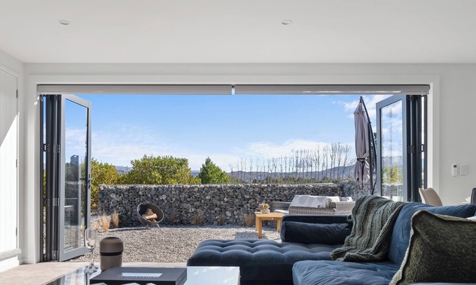 Drive right up to the door to drop off bags, then park further back on the driveway so as not to encumber your view! Enter into your living room with sofa, smart TV, dining table, hidden sink, microwave and kitchen. Look out of or open the bi-fold doors to views of Old Man Range and paddocks.