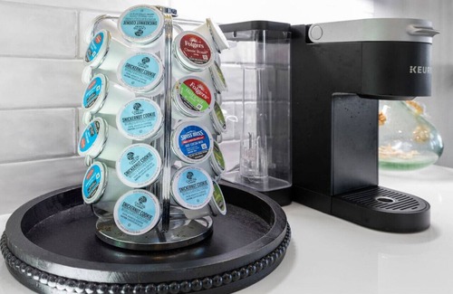 - The fully equipped kitchen includes a full-size fridge, stove, microwave, dishwasher, Keurig, ample counter space, and all the essentials for cooking and dining.