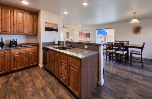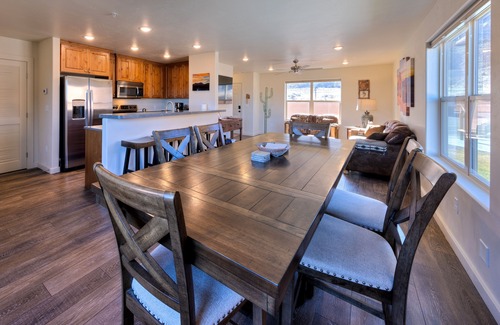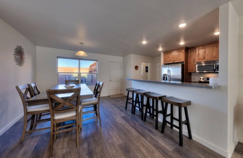 Unit includes fully stocked kitchen with quartz countertops and stainless appliances. Dining room seats 6. Two upstairs bedrooms each with King bed, smart tvs and ensuite full bathrooms. Dedicated workspace. Living room includes a 65" smart tv and Queen sofa bed. Complimentary high speed internet. Washer & dryer in the unit. Two dedicated parking spaces with room for overflow and trailers. Enjoy amazing views from back patio bistro while grilling on the gas BBQ. Spend your days hiking, biking, four wheeling and relishing in the beautiful sunshine and scenery of nearby National and State Parks. Enjoy rafting, kayaking and water fun on the Colorado River! Save some time to peruse the shopping and restaurants in the quaint town of Moab just 5 miles from the house. Resort like amenities included: community pool & hot tub (seasonal), playground, tennis & basketball courts.