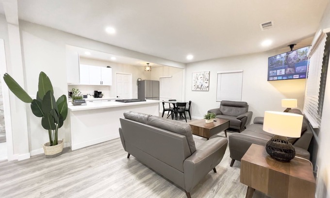 Our 3BR home is completely remodeled in 2022. It offers a fully stocked kitchen with brand new top of the line appliances, luxurious modern Ashley leather sofa set, AC, laundry room, 55" Samsung smart TV with spectrum TV services, fast mesh network WiFi (~450Mbps), comfortable memory foam queen bed, bamboo pillows, etc. The house will be professionally cleaned before each stay with clean linens, toiletries, and everything else you'll need for a comfortable stay.