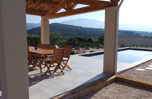 Air-conditioned house with contemporary decoration. Located at the entrance of Crillon le Brave, it is in a quiet location and only 500 m from the village. You will appreciate its high quality services (air conditioning, fully equipped kitchen, deckchairs, garden furniture, boules court, bicycle storage, etc.) and its large heated swimming pool in a landscaped and fenced garden. Its exceptional view of Mont Ventoux will delight you and whether to climb the Giant of Provence or simply to rest it is the ideal house that will offer you an unforgettable vacation! see https: // www. gitesenprovence84. com / villa-crillon