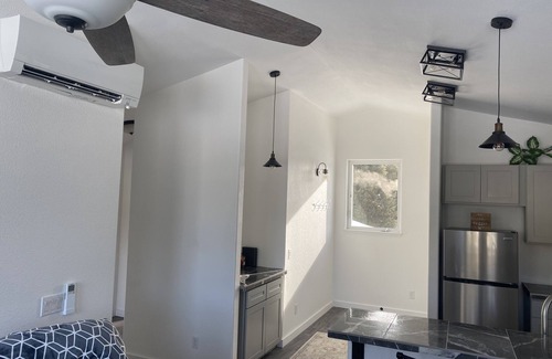 This is a new addition with a private entrance and stairwell into a one bedroom, spacious apartment. It has great views and huge windows so you can enjoy all the seasons Mt. Shasta has to offer. There is also a private patio.