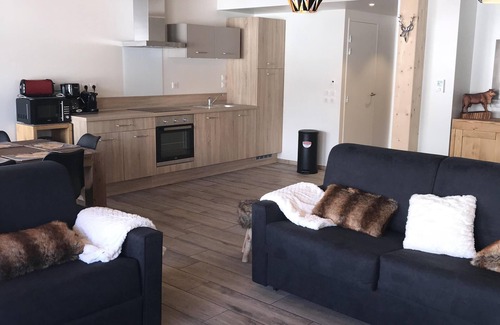 Residence LE GRENIER ski resort center on foot, large NEW apartment of 80 m2 for 8 people, upscale, fully equipped kitchen (Oven, dishwasher, fridge, ceramic hob, microwave, raclette and fondue appliance, toaster, kettle ...) great comfort, large cozy living room with two sofa beds, two bedrooms with 140 cm bed and one with bunk beds, two bathrooms, separate WC, 11 m2 balcony with a beautiful view of the surrounding mountains, ski locker. Shops nearby.