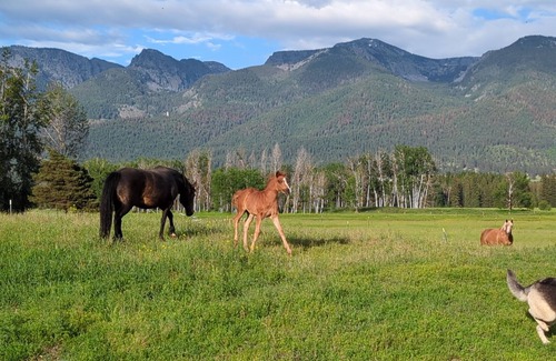 No dogs allowed. The ranch has 2 friendly working dogs who patrol the place and deter bears, especially during foaling season. They love people but are trained to defend against coyotes and other dog threats to the horses. This is a veteran-owned business and we welcome veterans with legitimate service dogs. Please communicate with the owner ahead of time so plans can be made. Dogs must be leashed at all times.