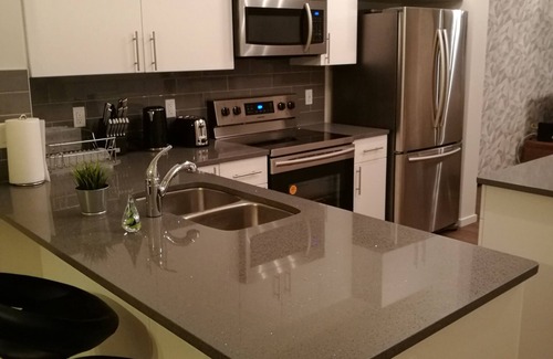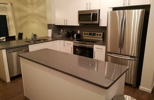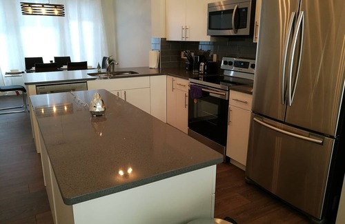 The kitchen is beautifully finished with white cabinets and a light grey Quartz countertop. It is fully stocked with pans and pots, utensils, sea salt and pepper, cooking oil. All stainless steel kitchen appliances are from Samsung and guests can have full access to the kitchen during their stay. The coffee/office area is on the other side. There is a Keurig machine, guests can feel free to bring their own k-cups if they want their perfect cup of coffee in the morning. Guests can also try our k-cup selections that changes from time to time (subjected to availability from stores).