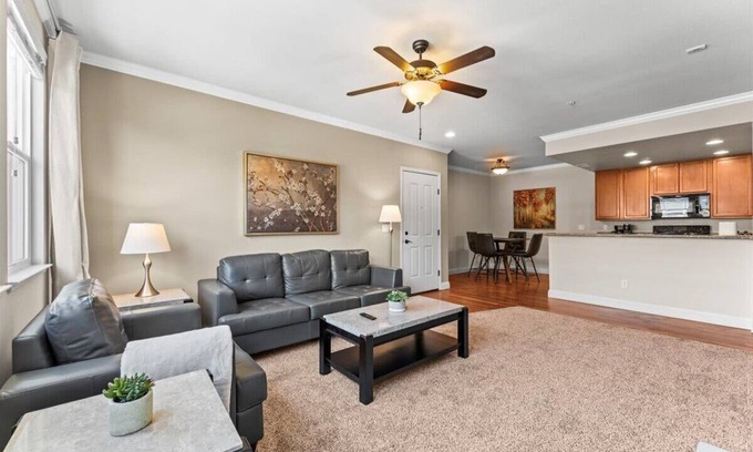 This comfortable living area is perfect for starting off the day with your cup of coffee or winding down your night with a drink. The Smart HDTV comes with a complimentary Netflix subscription to keep you up-to-date with your latest TV binges. Whether you're looking to kick back and relax or catch up on your favorite shows, this living area has everything you need. You also have a full-sized washer and dryer in this unit. Walk right on out to the balcony for a breath of fresh air while enjoying your freshly brewed coffee using the drip machine.
