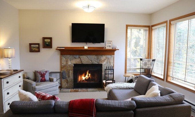 The living area has an open floor plan with a large picture window showcasing lovely views towards the valley. Additional niceties include a stone fireplace, complimentary high-speed wireless internet, an outdoor BBQ, a large deck, high-end stainless appliances, a fully equipped kitchen, heated bathroom and kitchen floors, secured designated underground parking spot, additional underground guest parking is available, bike storage room, ample closet space and the added convenience of an in-suite laundry room. Guests can enjoy a community hot tub located only short walk from the unit.
