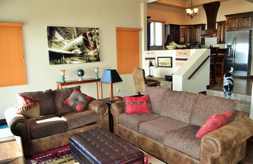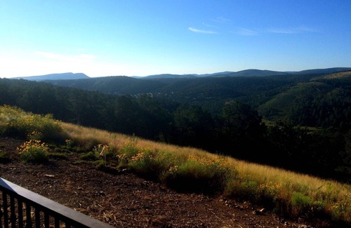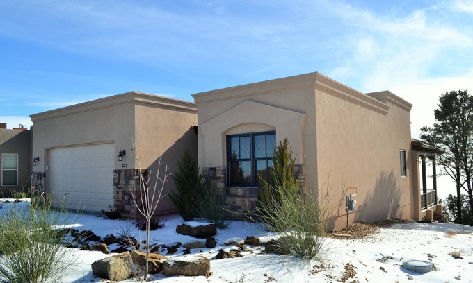 Cozy 2 bedrooms, 2 1/2 bath, new house in the Santa Fe style stucco design. Located right on the amazing Rainmakers Golf Club near Ruidoso, NM which is rated as one of the top 20 golf courses in the nation. The home is well furnished with top of the line linens, memory foam mattresses, flat screen TV's, Blu-ray DVD, satellite TV, high speed internet and good cell service gives you all the amenities of home. Sleeps a maximum of 6 with the fold out queen sofa. The central air and heat makes the house comfortable in any weather. After a challenging day on the golf course, enjoy a 270-degree mountain view from the back deck in our luxurious hot tub. Amenities include an outdoor gas fireplace to keep you warm while you sip a glass of wine in the evening or a hot coffee on a cool mountain morning. Well stocked kitchen, cozy, comfortable and relaxing. Full use of the private Rainmakers Golf Club are included with the exception of the workout room. No better place to get the knots out of your rope!