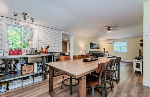 Welcome to Cammidge Place Retreat, your perfect getaway nestled in the heart of Sauble Beach. This charming, 4-season bungalow offers a warm and inviting atmosphere with modern amenities. Enjoy the comfort of a spacious living area, complete with plush seating and a cozy ambiance, perfect for unwinding after a day of exploration. The open kitchen is fully equipped for all your culinary needs, featuring sleek stainless-steel appliances and a large dining table for family meals.