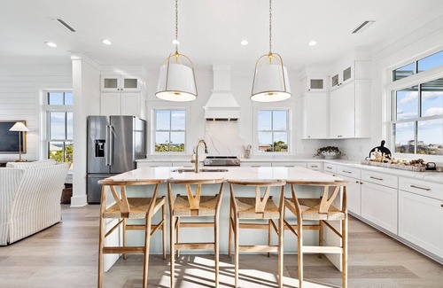 On the third floor awaits the impeccably designed great room, adorned with crisp white shiplap walls and golden accents. The kitchen’s gleaming countertops and KitchenAid appliances invite joyful culinary exploits, while the 4-person breakfast bar makes it easy to entertain. To the side is a dining table with 3 chairs and a banquette bench for 2 beneath an effervescent chandelier. When it’s time to relax, sink into the living space’s 2 striped armchairs and plush sectional to catch up with loved ones or stream favorites on the 55” Smart TV. The balcony offers sweeping views of the neighborhood, peek-a-boo glimpses of the water, alfresco dining at the table for 10, and a cozy spot for intimate conversation and sunset cocktails.