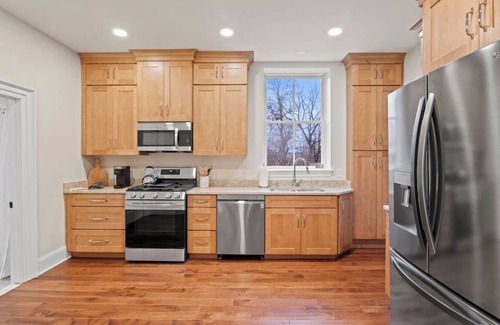 No detail spared in the fully equipped kitchen with brand new hardwood floors, custom soft-close cabinets, and stainless steel appliances. 🍽️ Quartz countertops, a gas stove, dishwasher, and Keurig await, making it a chef's haven. The non-functional fireplace adds ambiance.