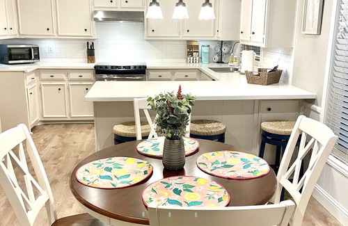 Bedrooms are spacious with comfortable and fresh linens. One room has a king bed, one has a queen bed, and one has a full-size bed. Luggage racks and USB connections are there for your convenience. The kitchen is large enough for hosting your family and enjoying either home-cooked meals or any of the wonderful take-out locations nearby. The backyard is large and has plenty of room for the kids to run around.