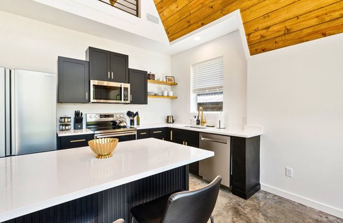 Each bedroom offers a cozy retreat, complete with a plush king bed and a calming, modern design. Upstairs, the loft provides extra sleeping space with a queen mattress tucked into the upper nook and a queen sleeper sofa below, making it a flexible spot for families or groups. Two full bathrooms are thoughtfully finished with stylish tile and contemporary fixtures, giving everyone plenty of space to refresh and relax after a day of exploring.