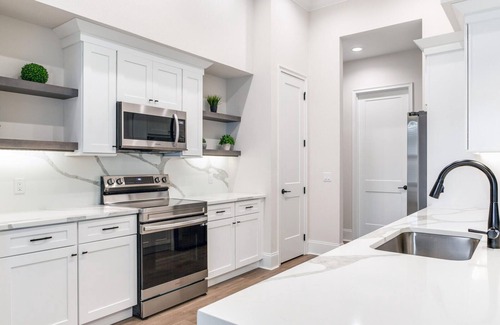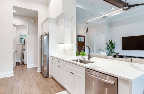 **Fully Stocked Kitchen**: Cook with ease using stainless steel appliances, quartz countertops, and a complete selection of plates, dishes, pots, pans, and utensils.