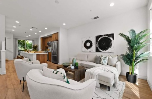 modern living in this 2 bedroom, 2.5 bath tri-level unit within the Ice House Gated Community. Built in 2020, this all-electric home showcases thoughtful design finishes, including an expansive open concept kitchen, light-filled living room, and cozy dining area.