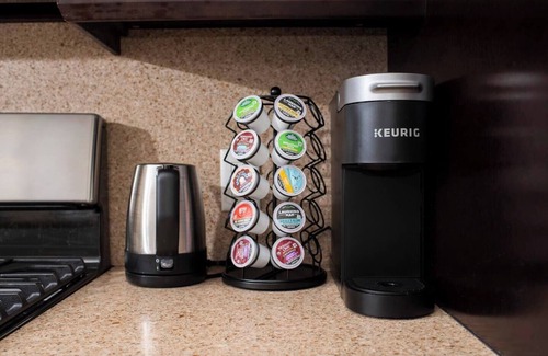 glassware, flatware, toaster, microwave, blender, Keurig, electric kettle.