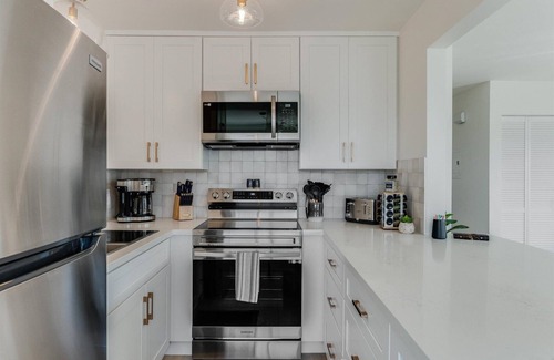 Relax in the spacious living room, complete with ample seating and a flat-screen TV, offering a perfect spot to unwind. Prepare delicious meals in our fully equipped kitchen, boasting stainless steel appliances, including a coffee maker, and dine either at the breakfast bar or the large dining table, surrounded by your loved ones. Indulge in the stylish and well-appointed bathroom, stocked with quality hair care products and soap, offering a touch of luxury to your stay.