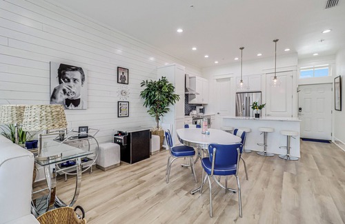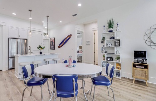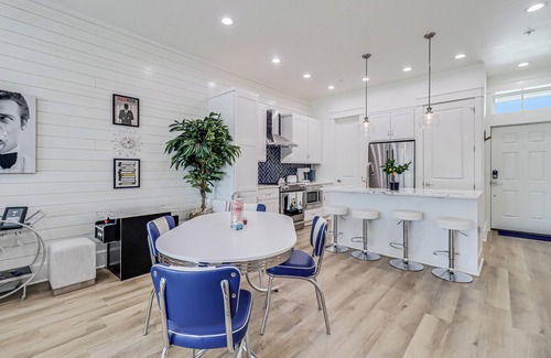 MAIN LIVING: Convene in the den area where a sleek, all-white sectional faces a giant, wall-mounted flat-screen TV, perfect for a big game or movie night! Play cards or serve meals at the round dining table with seating reminiscent of your favorite, old-school diner. A hallway bath off the customized kitchen with bar-stool seating at the island helps you entertain a crowd with ease. An arcade game top and Smart TVs throughout keep the retro vibe while keeping it conveniently modern.