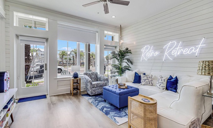 Retro-chic décor feels fresh and coastal at this pet-friendly, first-story condo in Cinnamon Shore North! Relax on the swinging chair on the patio, then step inside to gorgeous blue-and-white interiors that take you back to simpler times! A neon “Retro Retreat” sign against shiplap siding announces you’ve arrived!