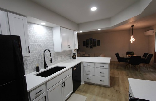 3. Contemporary great room with cozy couches, smart TV, dining table, bar and fully equipped kitchen