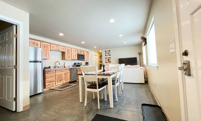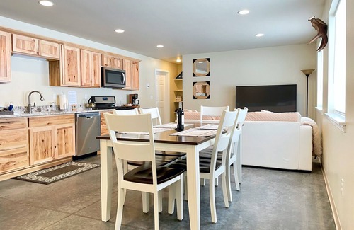 Enjoy Alaska the Alaskan way! This new cozy secluded 1 bedroom, 1 bathroom apartment with in-floor heat just finished construction the beginning of 2022. Located just 15-20 minutes from the heart of Wasilla on Knik Goose Bay road on a private lot near the historic Tug Bar and Grill and Knik lake for swimming and summer family fun. Within minutes of beautiful views of the Chugach Mountain Range and a cozy fire pit to enjoy the land of the midnight sun all year round with no neighbors in sight! This apartment comfortably sleeps 4 with a king size bed in the bedroom as well as a futon in the living room area. Enjoy use of a washer and dryer, a full kitchen as well as a full bathroom. Located in half of our lightly used shop, you don’t have to worry about people or noise during your stay! We do have some baby items if requested.