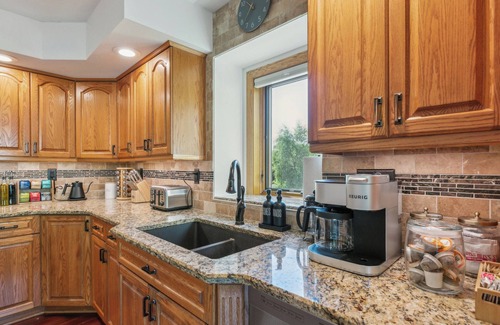 The large dining room seats 10, perfect for hosting memorable meals, while the spacious gourmet kitchen with island seating for four, is fully stocked with everything you need to prepare a holiday feast, including spices, a Keurig coffee maker, and a tea station.