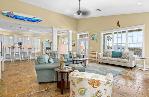 Off of the living room and kitchen is a convenient half bath, as well as the oversized, large master suite which has vaulted tray ceilings, Flatscreen TV & an ensuite full bath. The 2nd bedroom offers twin beds and a TV, nice bureau's, plenty of closet space and coastal decorating the 3rd bedroom has a king size be, TV and the full bath between each bedroom in the hallway. The utility room with front loading washer and dryer are located on the bottom floor along with the 2 and 3rd bedrooms and offers plenty of room to fold and sort laundry.Extra sleeping on a new pullout couch in living room SLEEPS 2 and extra cot beds and blowup beds AVAILABLE FOR children The private garage and driveway have plenty of room for 5 vehicles if needed. This house is beautiful inside and out with ocean and beach views. There is a propane grill 2 new beach cruiser bikes, beach chairs, towels, boogie boards and kids beach toys. The Beach access is steps away and takes care of that to enjoy the peaceful, serene ocean. If you would like to rent a golf cart we also offer that please just ask .Come on down relax, and enjoy a great beach vacation. We would love to have you. If you have a pet their is a pet fee and pet rules we also need to know the breed.