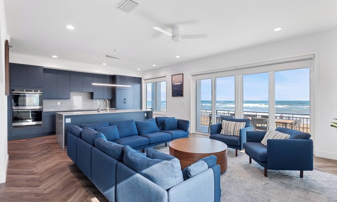 Fall Storm Cancellation Policy Available:). This modern oceanfront retreat sleeps 12, offering 4 bedrooms, a flex room with a queen sofa bed, and 3 full baths. Enjoy a gourmet kitchen with Fisher & Paykel appliances, Samsung Frame TVs, two oceanfront patios, and a heated pool. The game room includes pool, poker, and table tennis for added fun. Perfect for families or groups, this home blends luxury, comfort, and stunning views for an unforgettable stay. Signed lease agreement required, pet fee one pet allowed per stay.