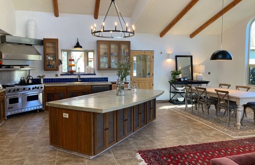 Kitchen is equipped with massive custom chef's stove along with brand new high end, farmhouse basis sink, refrigerator, built-in dishwasher, drink fridge, concrete island with separate sink, along with new kitchen cutlery etc.