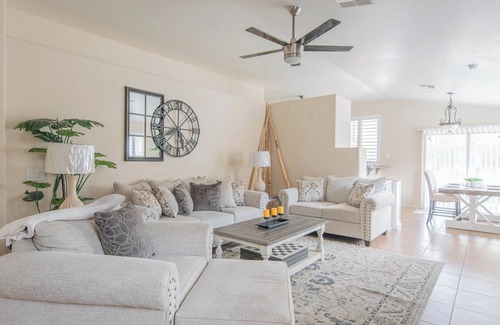 Luxurious 4-bedroom 2 bath home, in picturesque Laveen Village, Arizona! Nestled in a serene neighborhood, this charming retreat offers a perfect blend of modern elegance and tranquil surroundings, making it the ideal destination for a relaxing getaway.