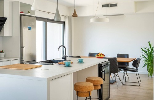 As you enter the ground floor, you're greeted by an expansive 57 sqm open-plan living area, where natural light floods in through sliding doors that offer effortless access to two covered outdoor dining areas—one conveniently located in front of the kitchen, and the other nestled beside the barbecue, perfect for al fresco dining. This space is fully air-conditioned and boasts a flat-screen TV, free WiFi, and a Play Station 4 for your entertainment. The modern kitchen, complete with a stylish island, encourages culinary creativity while providing captivating sea views.