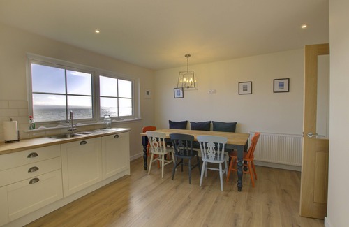 On the ground floor, guests will find a spacious entrance area perfect for storing golf equipment or outdoor gear, along with a convenient shower room. The separate laundry room is fully equipped with a washing machine, tumble dryer, and additional storage space. The kitchen and dining area have been finished to an exceptional standard, with modern amenities including an electric oven and hob, dishwasher, fridge, freezer, coffee machine, and a cold water pot tap for easy filling of pots. The dining table comfortably seats eight across 5 chairs and a bench, offering the perfect setting for family meals with views over the garden and out to sea.