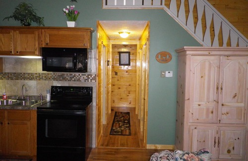Beautiful 3 bedroom chalet, all newly renovated with knotty pine interior, new flooring, new kitchen, new bathroom, 2 new queen beds and new bunkbeds (sleeps 6 adults). Located on a large, wooded lot in a quite setting. Large front porch if you want to sit out and relax, and a fire pit a few steps down from the porch.