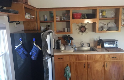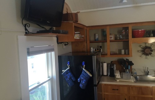 The kitchen includes a refrigerator, oven/stove top, microwave, toaster oven, coffee maker and teapot. We also have AC for the summer season!