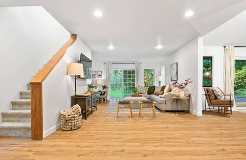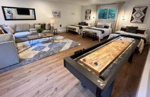 As great as the main home is, some of the best amenities are close by and out outside! Just off the main living and dining area is a huge deck with a hot tub and manicured outdoor space with a firepit for enjoyment. The Sandy River is just a short walk down the path where you can enjoy the sites and sounds and perhaps do some fishing from the banks. Without a doubt, every group will be spending some time in the 'bunk house'. There you will find three full beds, a huge couch, a TV setup for streaming and a brand new shuffleboard game!