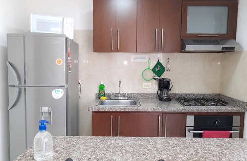 Studio apartment with double bedroom. The room has air conditioning. Cable TV including NETFLIX, the apartment has a sofa, kitchen, oven, microwave, refrigerator, blender, washing machine, coffee maker, sandwich maker, dishes. It has desk, executive chair and printer, wifi, has a balcony. The building has 24 hour security and security guard. The building has a swimming pool, sauna, gym, playground, private parking. Located very close to business centers, banks, notaries. It has easy access and exit by main roads.