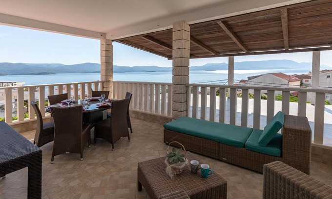 Two beautiful apartments near the sea, an ideal place for friendly families who want to travel together. CDR315 is located on the first floor. CDR136 is larger and placed on the 1st floor, while CDR166 is on the 2nd floor. From the covered terraces overlooking the sea, you can experience the enchanting play of colors of the sunset in the evening. At the back of the garden is a covered terrace with summer kitchen and barbecue. The pebble beach is about 50 m away. Komarna is a small place with good possibilities for trips to Dubrovnik, Mostar or to the island of Korcula.